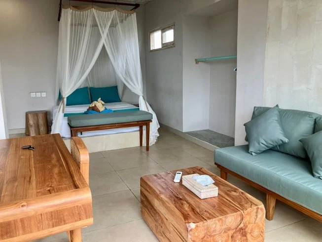 Du wohnst in einem balinesischen Guesthouse direkt an der Küste – viele Zimmer haben Meerblick und du kannst mit dem Rauschen der Wellen einschlafen. Die Ausstattung ist simpel, aber sauber: